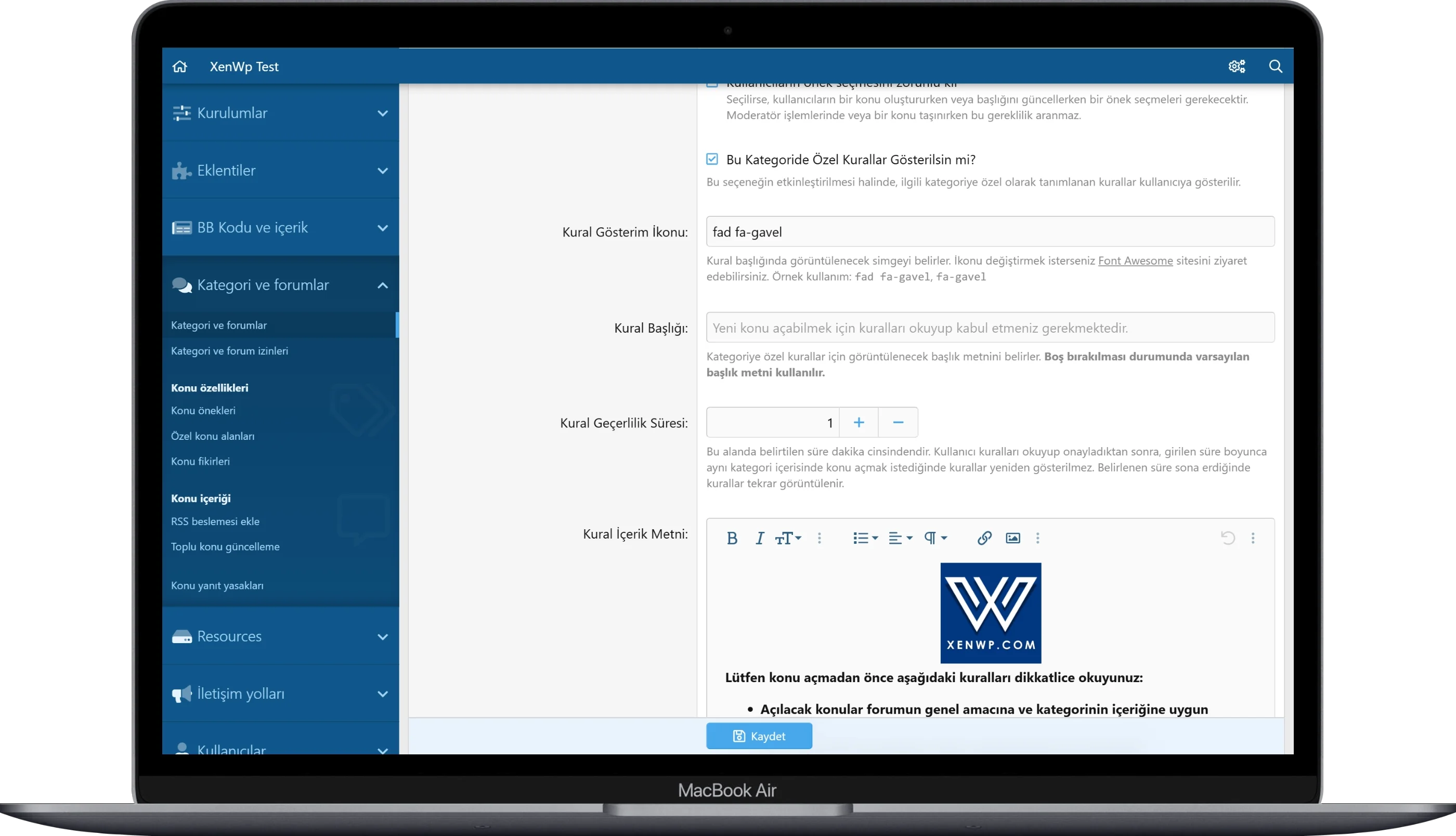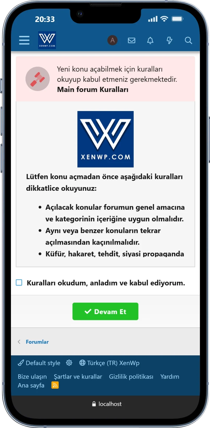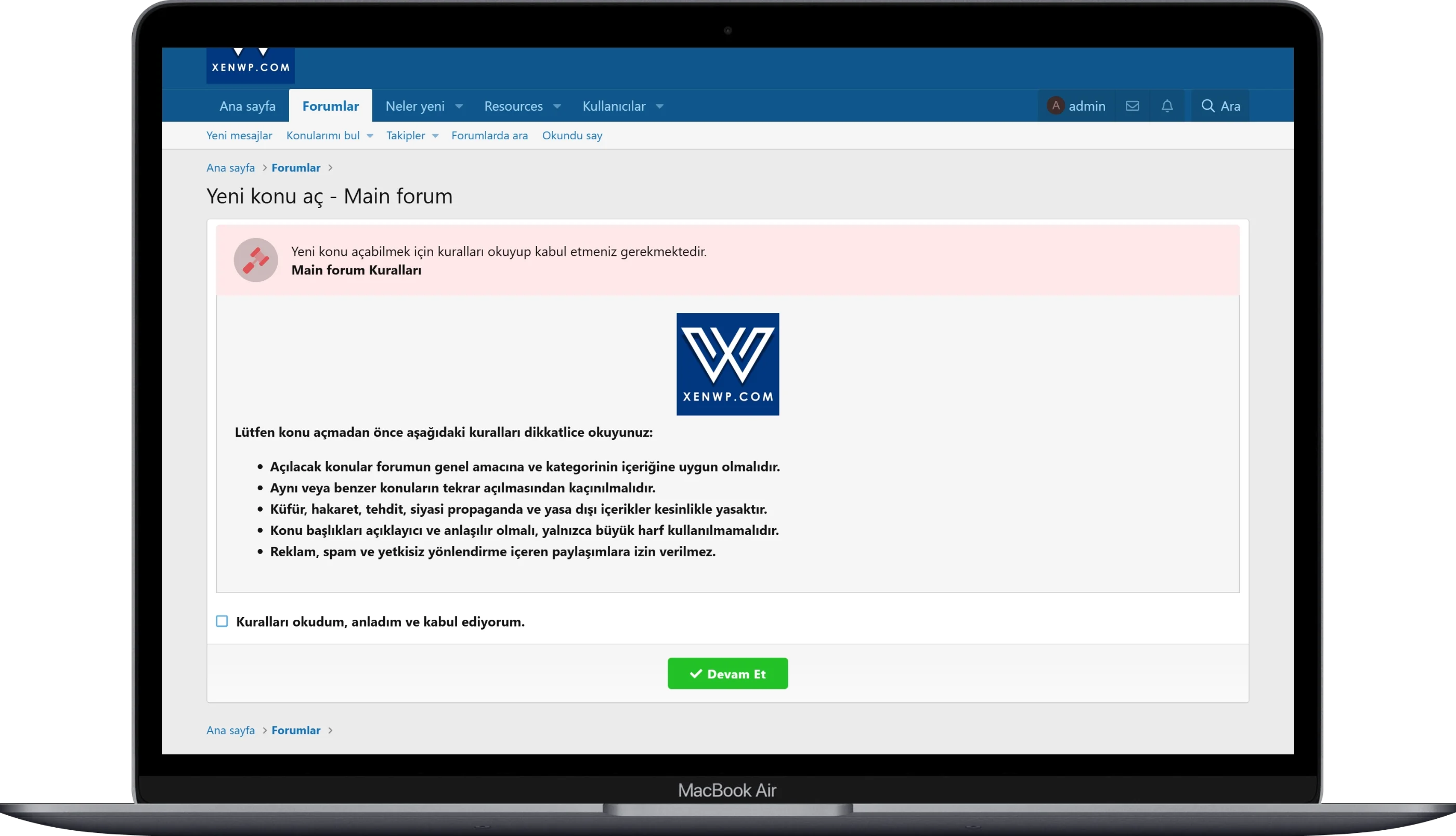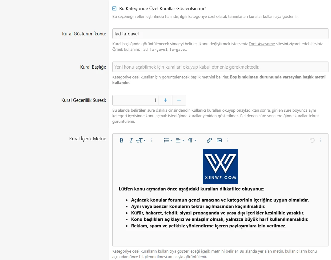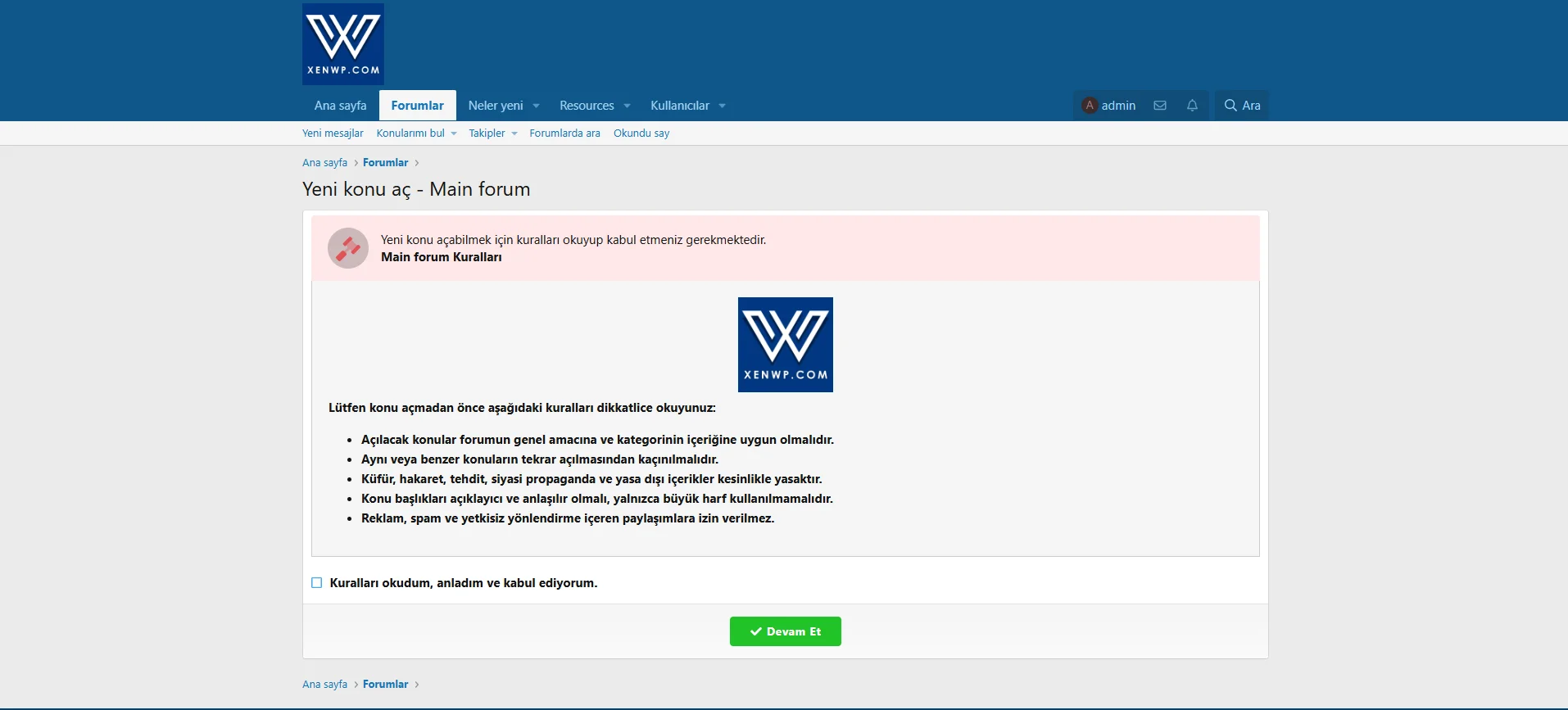 Kullanıcıların, kuralları kabul etmeden ilgili kategoride konu açamamasını sağlayan sistemin tüm metinleri doğru ve eksiksiz şekilde yansıtılmıştır.