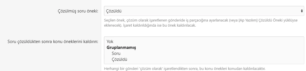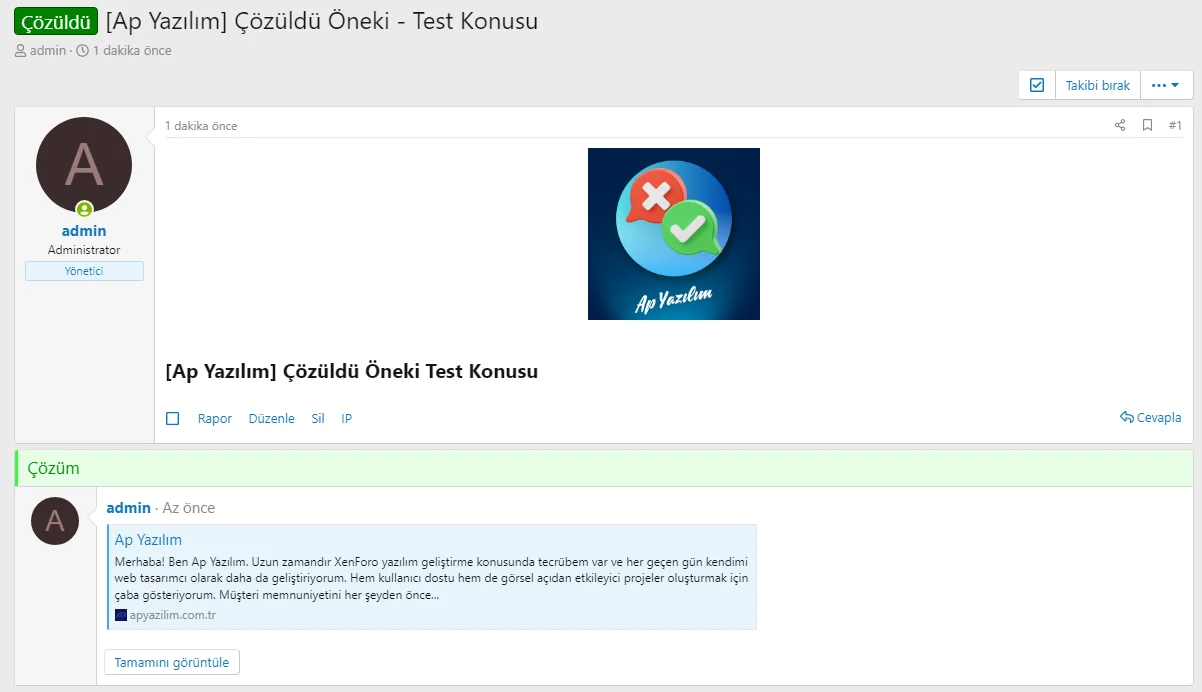 Ap Yazılım] Çözüldü Öneki, soru–cevap ve teknik destek odaklı forumlarda çözüme ulaşan konuları otomatik olarak işaretleyerek düzenli bir içerik yapısı oluşturur. Çözümlenmiş soruların kolayca ayırt edilmesini sağlar, forum genelinde içerik karmaşasını azaltır ve kullanıcı deneyimini önemli ölçüde iyileştirir.